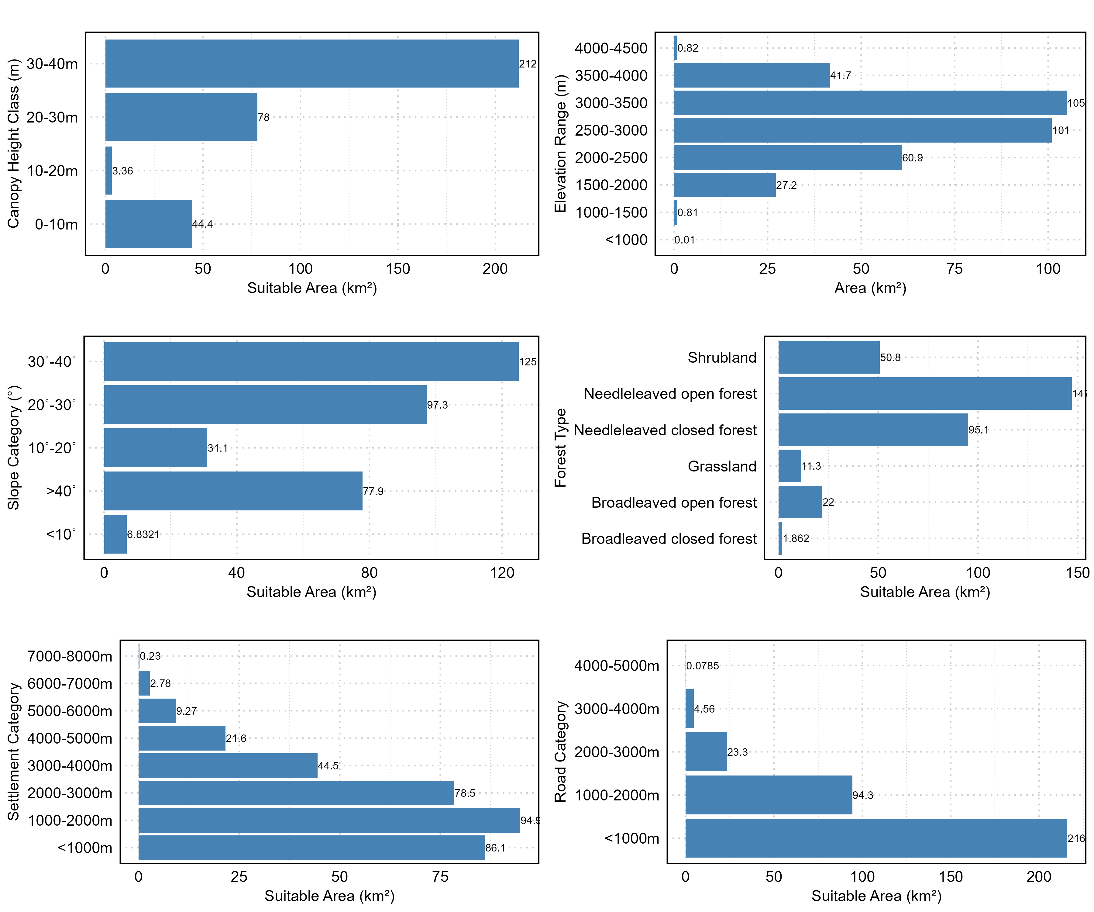 The study assessed red panda habitat suitability using data from transect surveys and remote sensing information on environmental factors, including bioclimatic, topographic, vegetation-related, and disturbance variables. Habitat modeling was performed with MaxEnt under three different scenarios. The study found NDVI and LULC to be key factors influencing habitat suitability. The model performed well, achieving an AUC of 0.86 and a TSS of 0.66. The GCA region has an estimated 337.17 km² of suitable habitat for red pandas, though the extent varies among local administrative units. About 102.54 km² of potential habitat lies within Gaurishankar Rural Municipality. The analysis showed that the most suitable areas are those with slopes of 30–40˚, covering 125 km², and elevations between 3000 and 3500 meters, covering 105 km². The largest habitat area, 147 km², was found in needle-leaved open forest, with needle-leaved closed forest covering the second largest at 95.1 km².